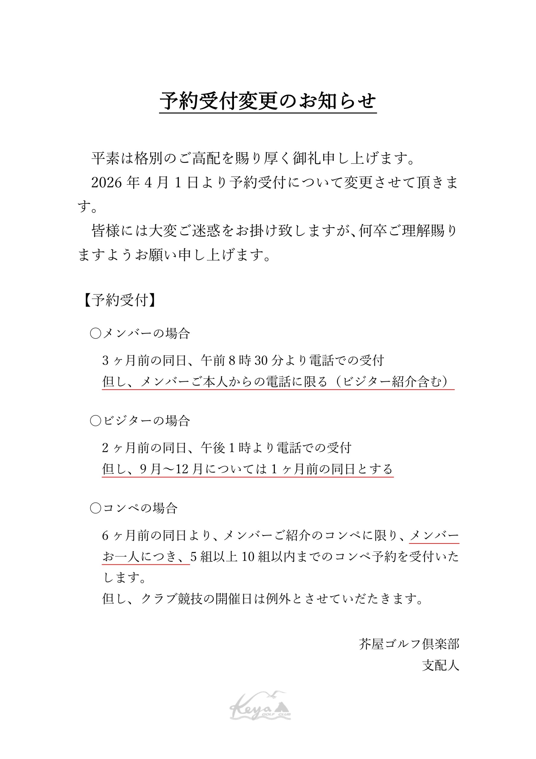 予約受付変更のお知らせ